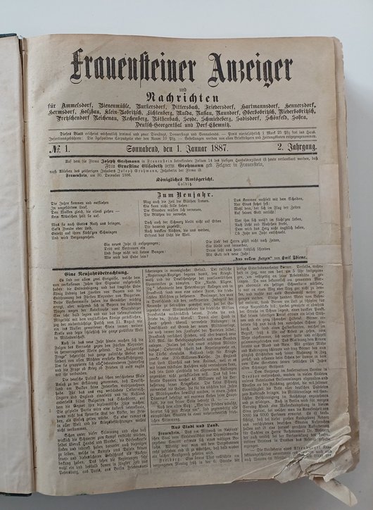 Jeden Monat landet bei den Einwohnern des Stadtgebietes Frauenstein das lokale Amtsblatt, der „Frauensteiner Stadtanzeiger“ im Briefkasten – er beinhaltet Bekanntmachungen, Ankündigungen, Werbung und Annoncen sowie allgemeine Informationen. Nur die wenigsten wissen, dass dieses Lokalblatt selbst schon eine über 150-jährige Geschichte hat!